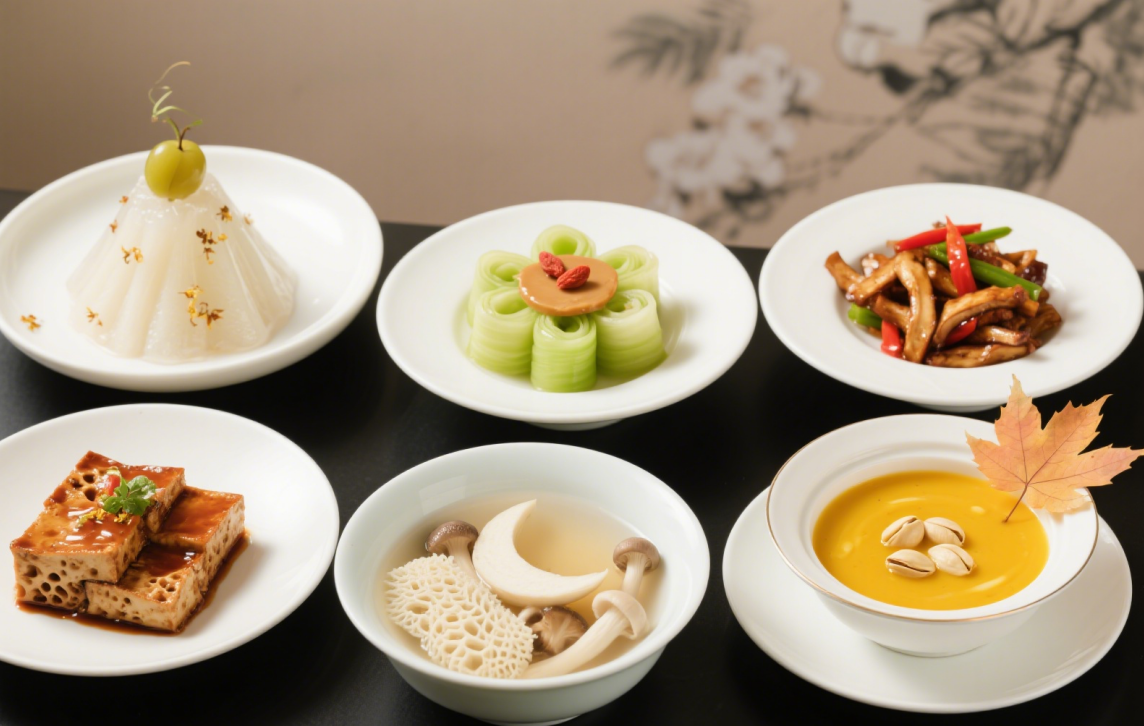凉菜类云水禅心(梅子山药冻):将山药蒸熟压泥,加少许盐塑成山形,用话梅煮水融化琼脂后淋在上面,点缀桂花,冷藏定型。其摆盘如山水云雾般,口感酸甜。 空谷幽兰(凉拌